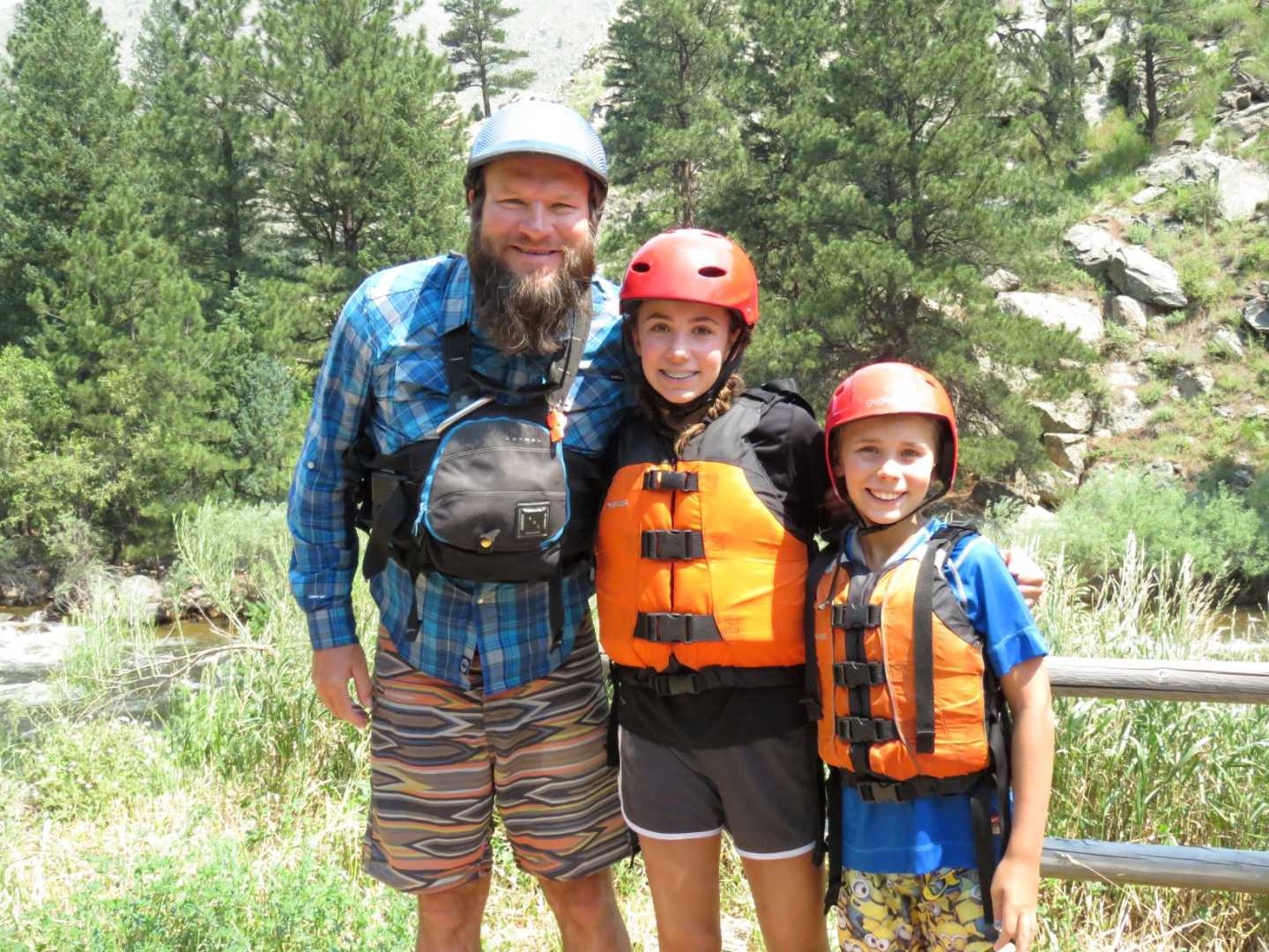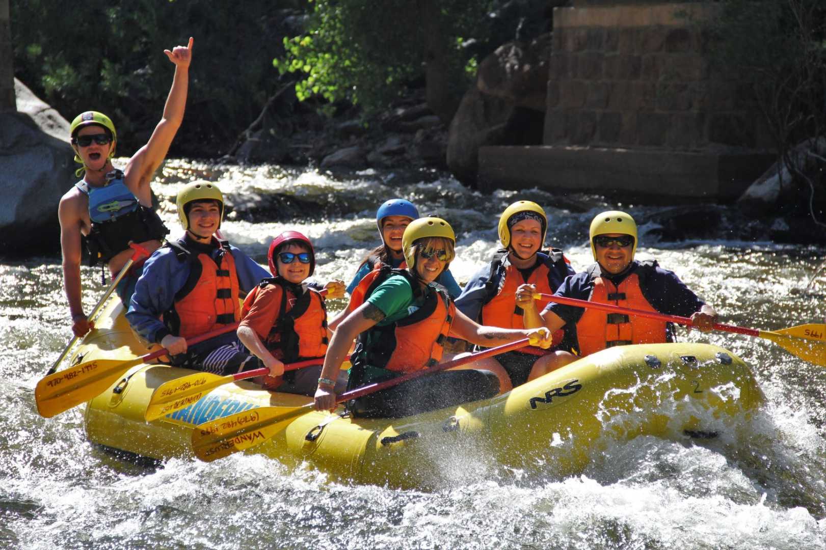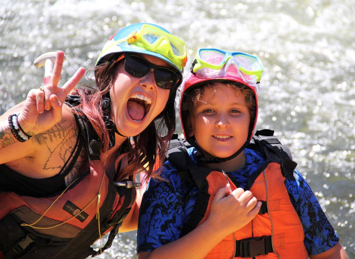 We use 8-person self-bailing rafts with foot holds and grab lines. Everyone wears a Coast Guard-approved Type V life jacket and helmet.